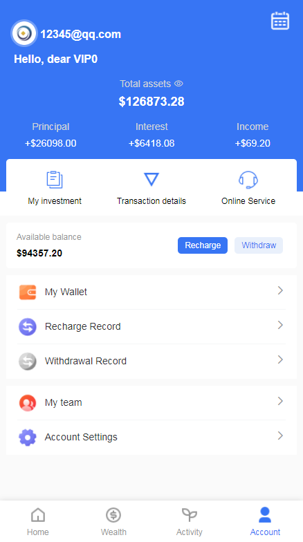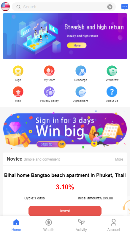 用户注册成功->认证邮箱->充值->购买项目->生成订单->根据设定的收益每日返利->末天返还本金->提现时先添加钱包->发起提现->后台审核通过->提现到账。后台语音播报,不错过任何订单;