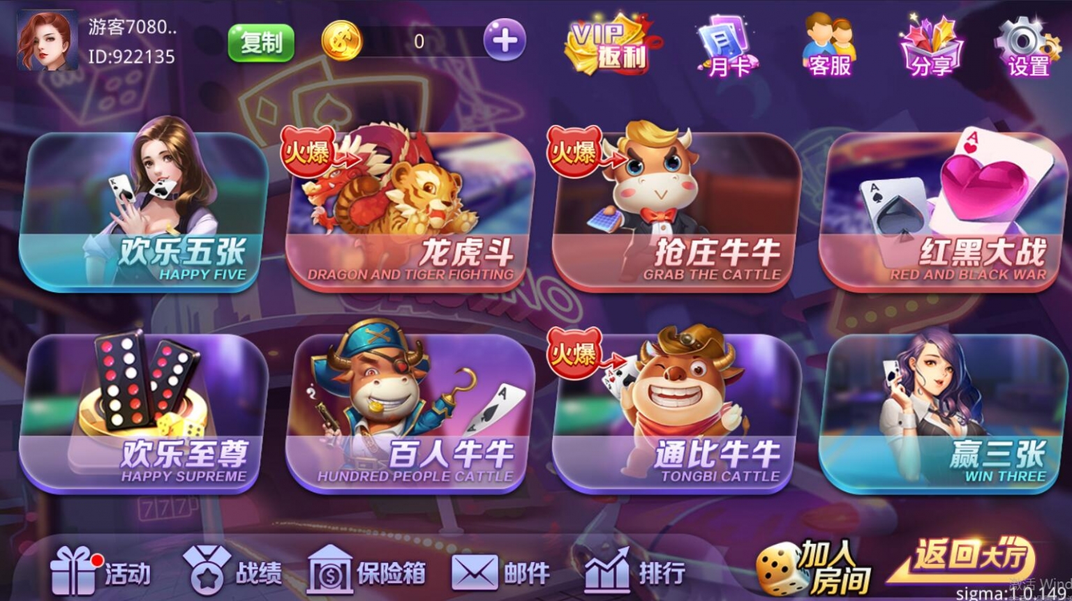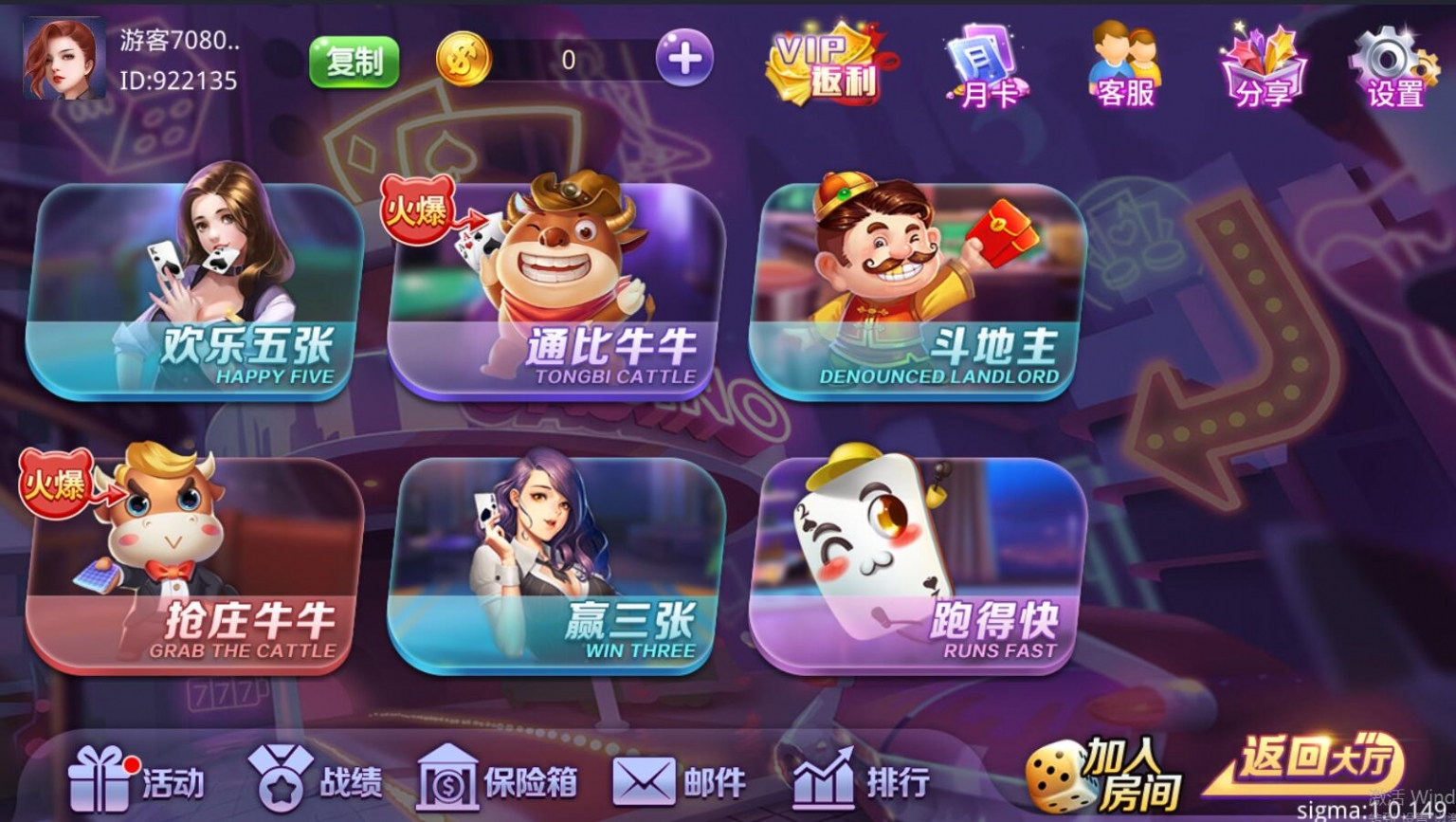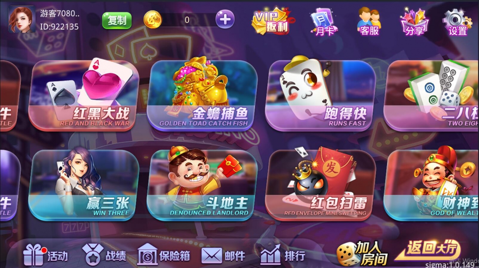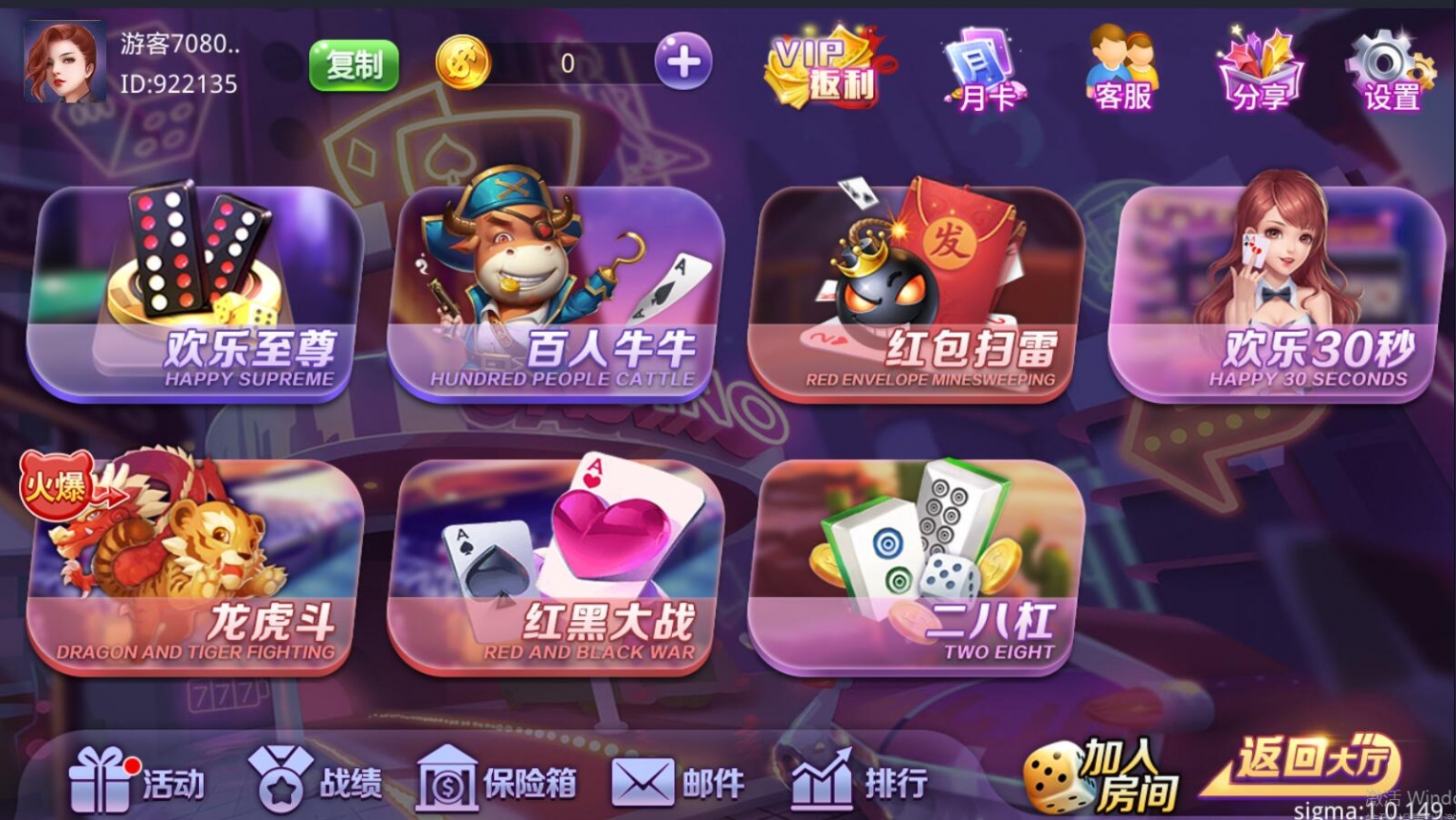 双模式,房卡+金币的类型。游戏比较多,具体看图吧