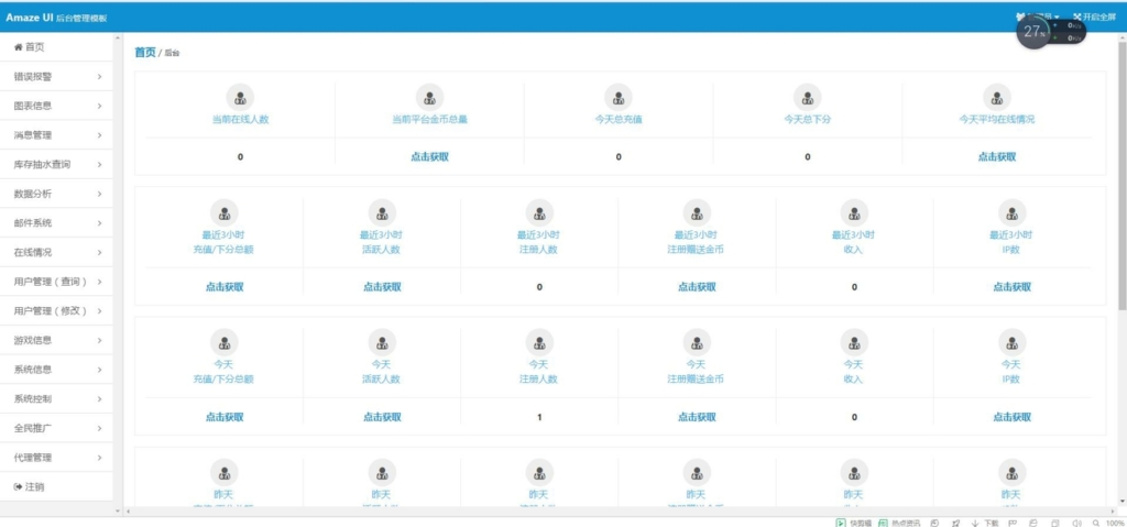 控制便捷功能强大,后台操作,房间控制,单控,库存均可 游戏内含: 棋牌游戏:Zha金花、斗地主、三公、通比牛牛、二人牛牛、 百人场:龙虎斗、红黑大战、百家乐、奔驰宝马、刮刮乐、跑马、水浒转、 金蟾捕鱼、大闹天宫、百人牛牛